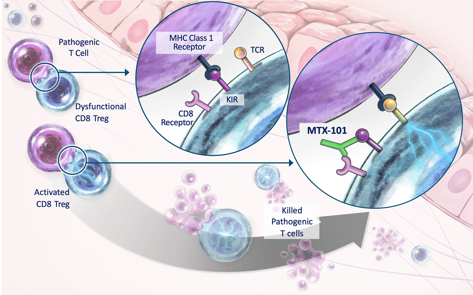 MTX-101 is a bispecific autoimmune checkpoint inhibitor. Its dual configuration binds the CD8 Treg receptors, KIR and CD8, to selectively activate CD8 Treg and enhance MTX-101’s specificity, respectively. MTX-101 is designed to restore CD8 Treg functionality and the destruction of pathogenic immune cells.