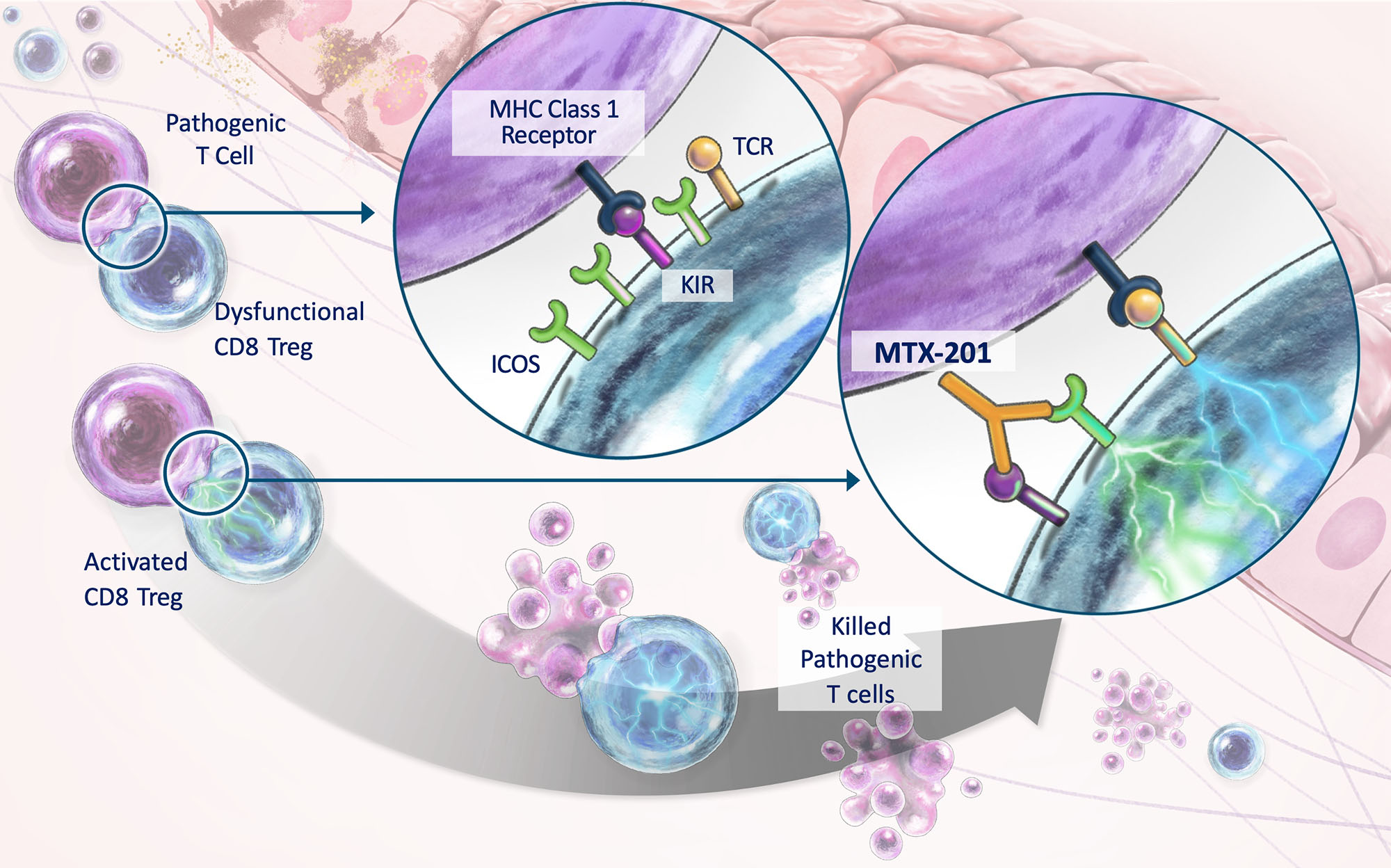 MTX-201 is a bispecific antibody that restores and potentiates the functionality of CD8 Treg via inhibition of KIR and activation of the ICOS costimulatory receptor, respectively, both expressed on CD8 Treg.